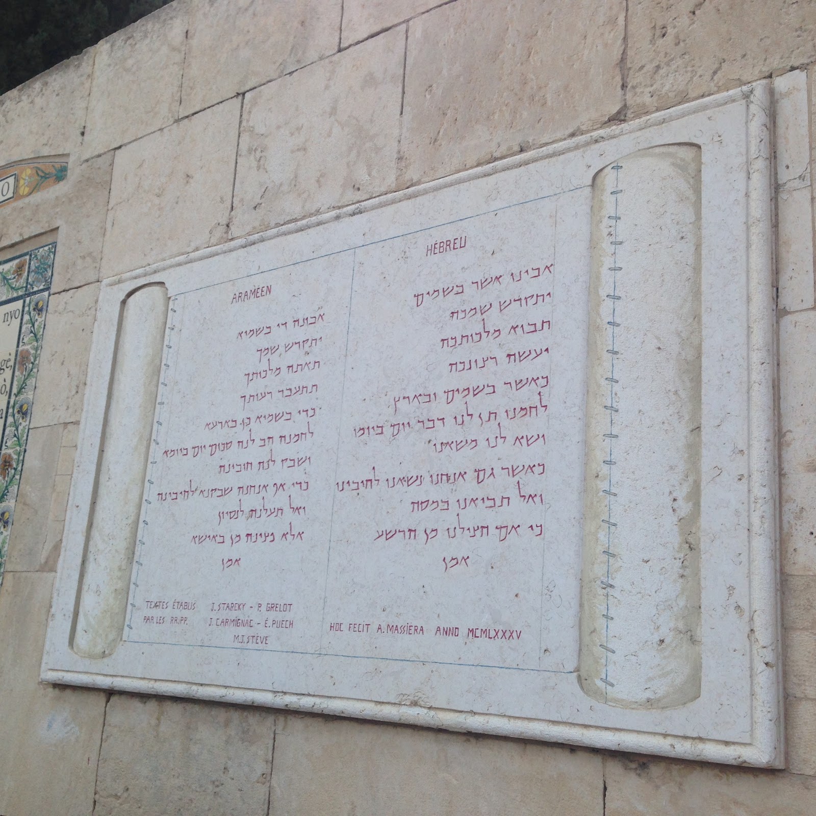 We head down the street, (which is only wide enough for 2 donkeys but cars come in both directions speeding around blind corners), and head into another church built by Helena, mother of Constantine, and is now run by the Carmelites. The grounds are beautiful, gardens everywhere and the Lord's Prayer written in every language posted all over the walls.